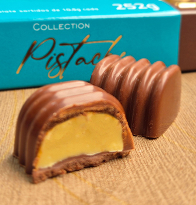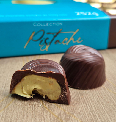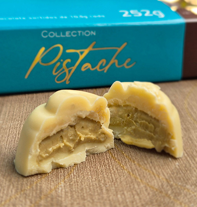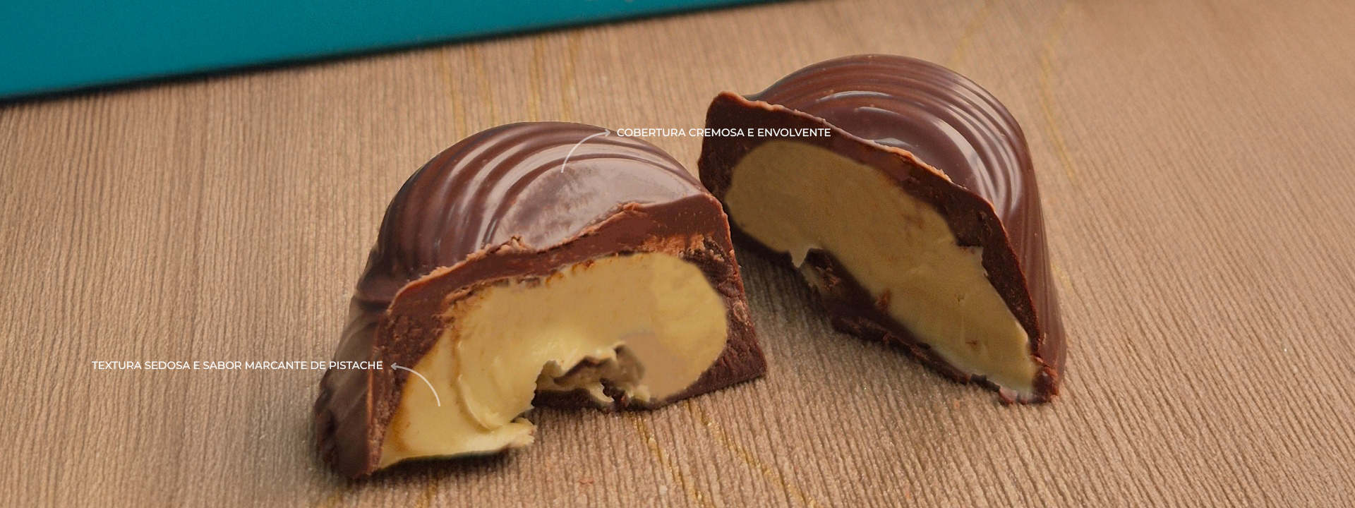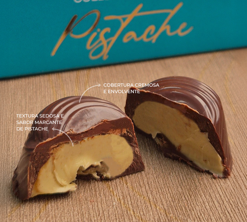 Intenso, aromático e sofisticado. O sabor marcante do cacau premium equilibra-se com o recheio cremoso de pistache, resultando em uma combinação elegante e inesquecível.