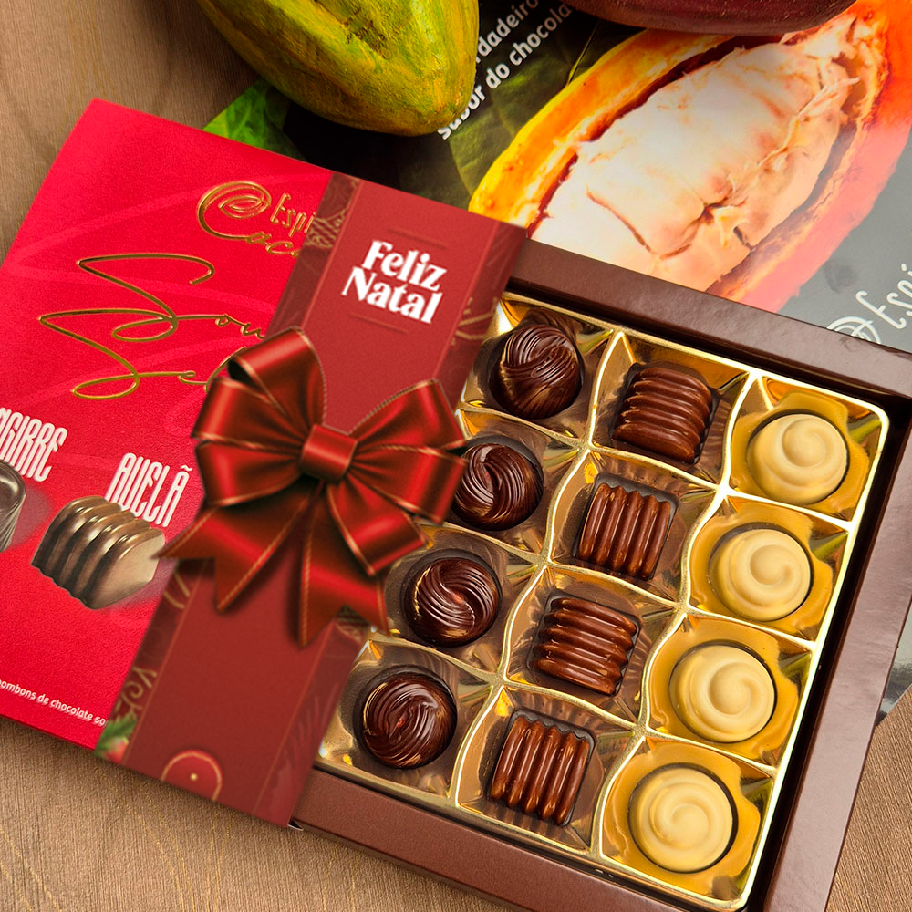 Nessa versão da Caixa de Bombom Soul Selection temos 24 bombons que combinam chocolates 44% cacau com recheio de avelã, 61% cacau com recheio cremoso de gengibre e chocolate branco com o delicioso recheio cremoso de pistache.