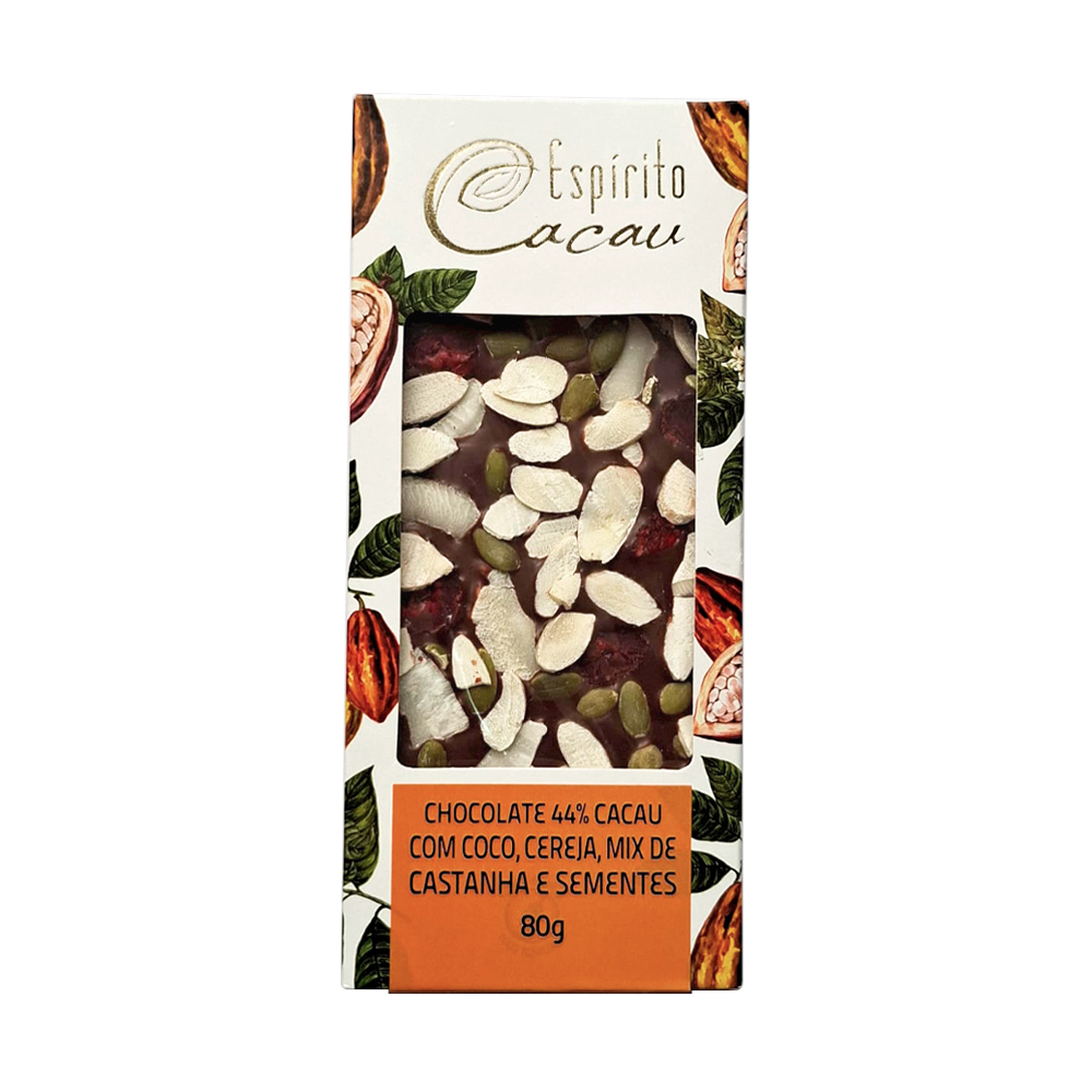 Tablete de Chocolate 44% Cacau c/ Coco, Cereja, Castanhas e Sementes - 80g